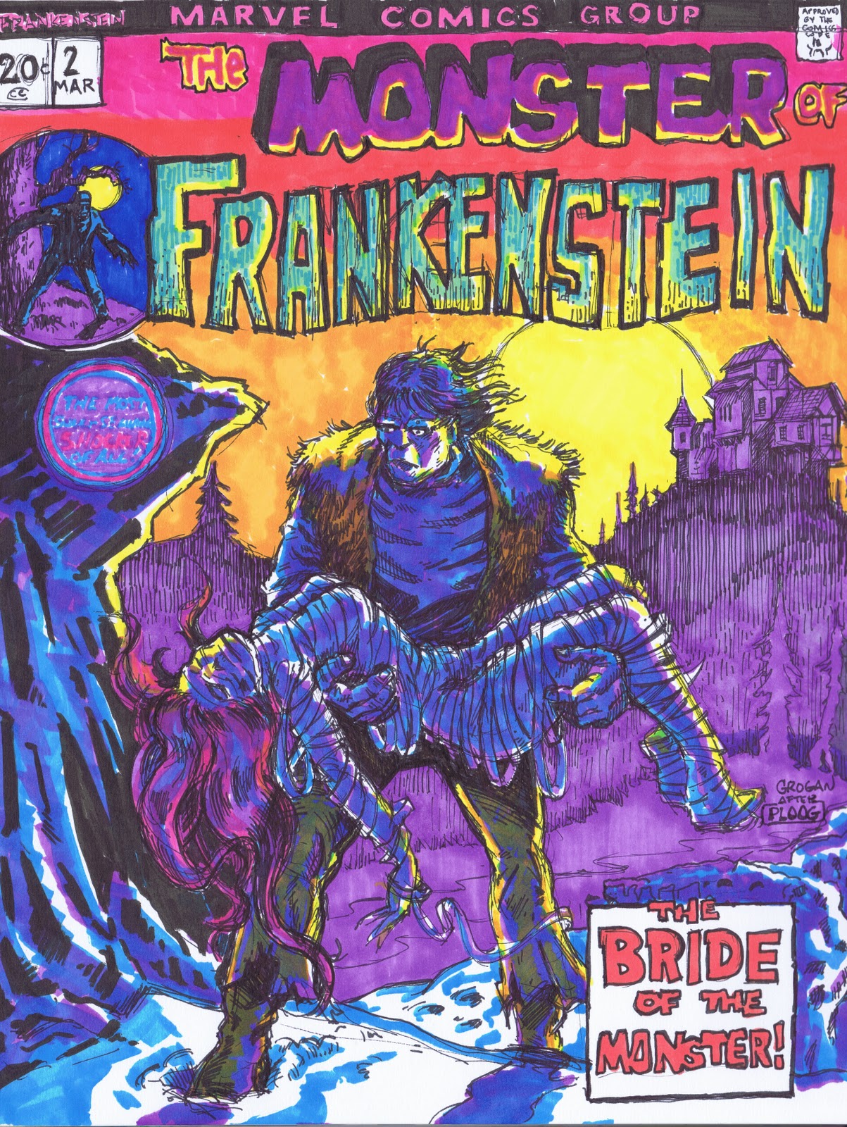 Well, yeh— I’ve been away from “Pulp Ink” for way, way too long -(a year and a half!)-and so— as a special event/re-introduction, for the entire month of February I’ll be making this space my own personal “covered” blog! My first example is to the right– “the Monster of Frankenstein no. 2” drawn by the great Mike Ploog, and covered by Grogan. The original cover by Mr. Ploog is below.
