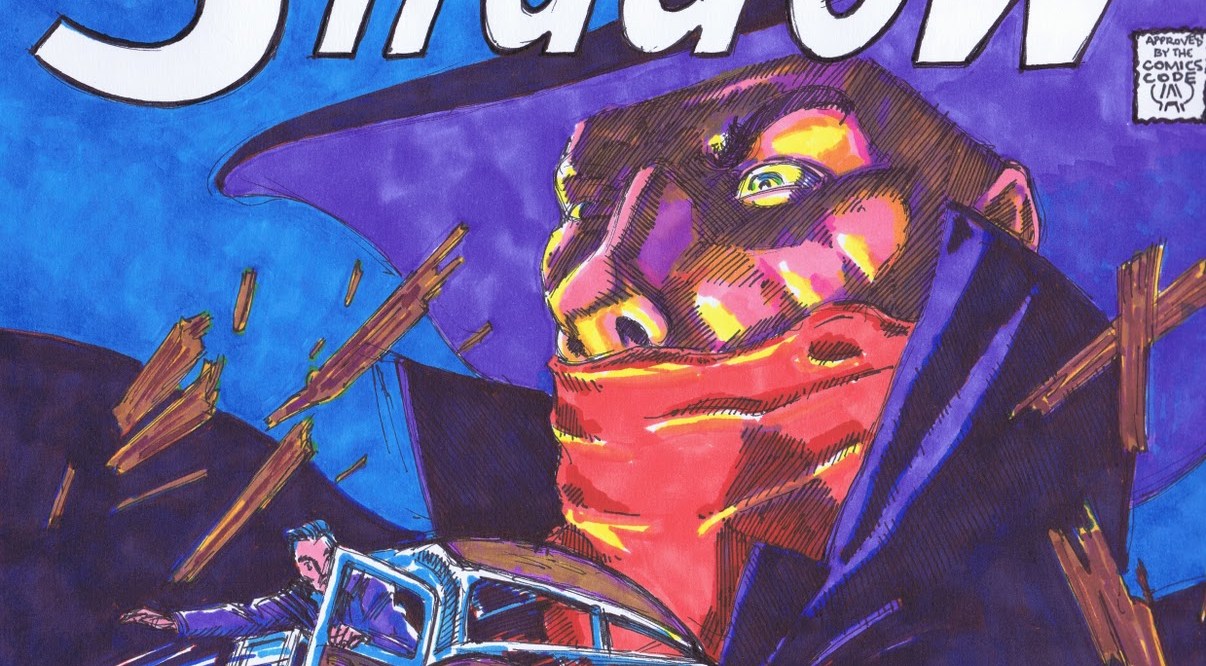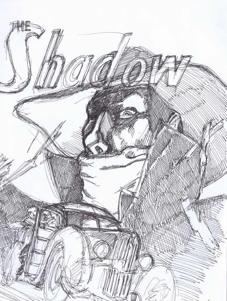 So when I first started this little project, these early “Shadow” covers were the first I chose. And initially, I was just going to sketch them out in b & w. I was well into it before I found I wanted to add color. The image above was my second shot at “The Shadow no.4”