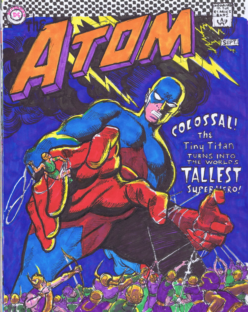 As a little guy I get a kick out of the Atom as a colossus. Great cover by Gil Kane in period when he did a lot of great covers for DC, on the Atom and Green Lantern in particular. The covers he did for DC are very different in their use of pictorial space from those he did for Marvel in the Seventies. The Marvel covers are -for the most part–divided between upper and lower tiers, compressing the area in which Kane placed his figures. In contrast, the DC covers from the sixties allow for more vertical freedom, and so we see a good deal more flexibility and freedom in Kane’s compositions. I’m guessing this was an editorial directive, because a good many Marvel covers of the seventies are composed accordingly, the artists might have been told that the action takes place within such and such an area below the logo. At the point in the sixties when “The Atom” cover was done, there doesn’t seem to have been such a directive at DC, and so their covers, by Kane, Infantino, Kubert and especially Adams-are unique in the freedom with which they play around with space. So this is one of Kane’s best, I think–and it’s wonderful for the way he pulls the viewer up and into the space, making the 6″ x 9″ picture area seem vast and The Atom himself as monumental as–oh–Mount Rushmore.