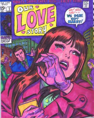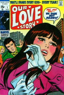 Everybody knows the Spiderman of Lee and Romita was essentially a love story. (as distinguished from the Spiderman of Lee and Ditko) Maybe it still is, I don’t know I haven’t read it in 30 years. Nevertheless–the girl on the cover of Our Love Story no.1 is a classic Romita beauty-so why shouldn’t she be Mary Jane Watson?