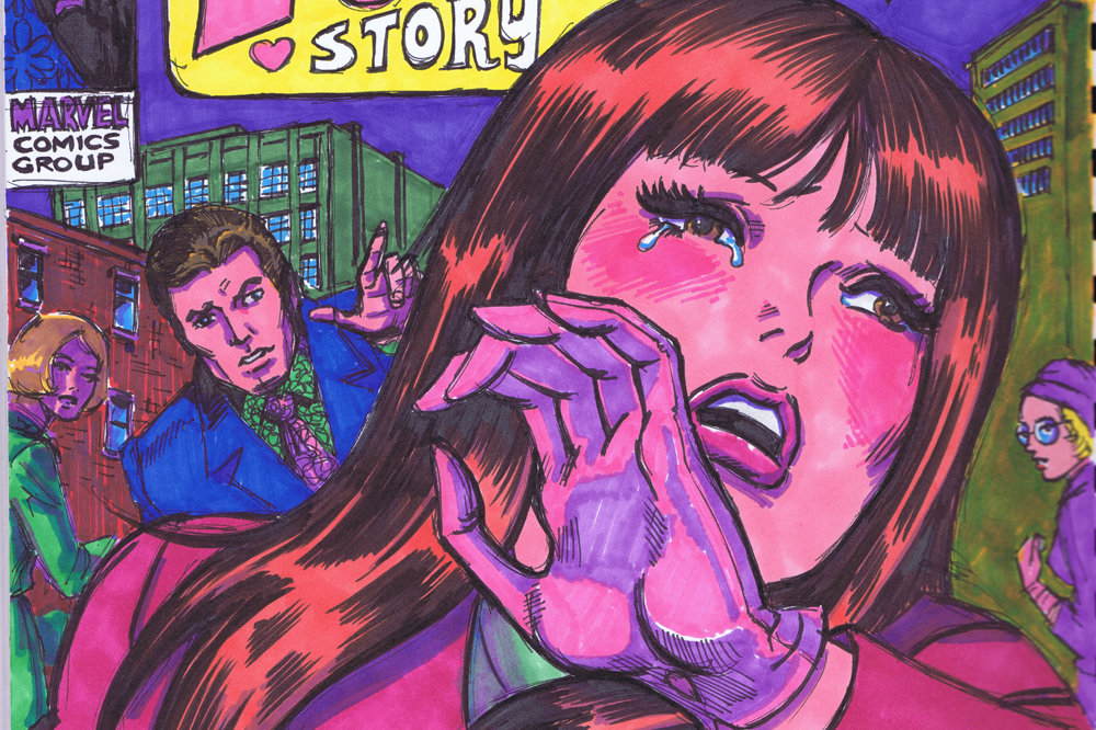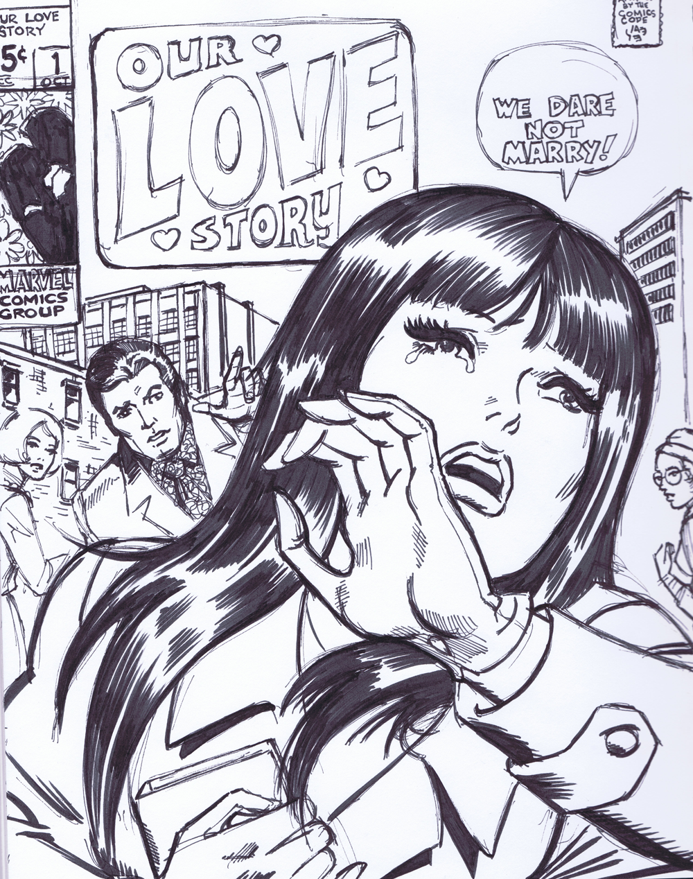 Everybody knows the Spiderman of Lee and Romita was essentially a love story. (as distinguished from the Spiderman of Lee and Ditko) Maybe it still is, I don’t know I haven’t read it in 30 years. Nevertheless–the girl on the cover of Our Love Story no.1 is a classic Romita beauty-so why shouldn’t she be Mary Jane Watson?