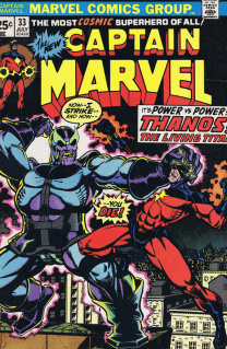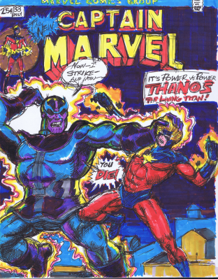 (* well, for this month, anyway. )Once again–this is from the very beginnings of this project, before I knew I was doing anything, and I drew this quickly one morning at work before the day began-so it’s really loose. It was fun to do. Coloring came later–and this was the first page I colored, so I was merely trying to replicate at this point. Rather than use black for the night sky, I layered ultramarine over a red-making for a richer night sky and saving my black markers! Drawing Thanos in action was the attraction–for my money, (all 25 cents of it in 1973) this is one of Starlin’s best depictions of him. What a great image! What a malevolent creature!