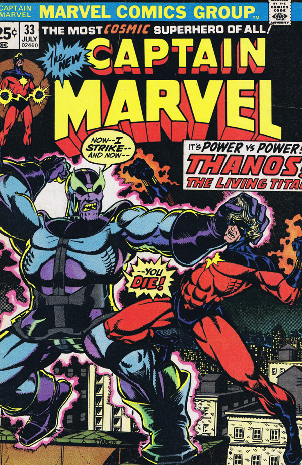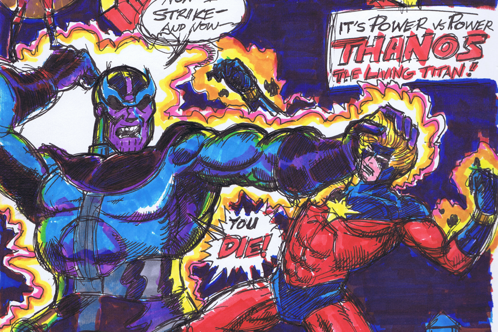 (* well, for this month, anyway. )Once again–this is from the very beginnings of this project, before I knew I was doing anything, and I drew this quickly one morning at work before the day began-so it’s really loose. It was fun to do. Coloring came later–and this was the first page I colored, so I was merely trying to replicate at this point. Rather than use black for the night sky, I layered ultramarine over a red-making for a richer night sky and saving my black markers! Drawing Thanos in action was the attraction–for my money, (all 25 cents of it in 1973) this is one of Starlin’s best depictions of him. What a great image! What a malevolent creature!