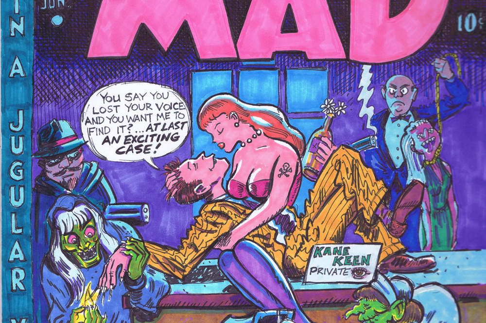 Even in the ’60’s, when Mad magazine was in its heyday, -and my friends and I sat on each others stoops going over every single gag in every single issue–these original Mads were special. They seemed like relics from a different, somehow more subversive, era–a little less predictable than the Mad we knew; wilder, not quite as formulaic. They had super-heroes! “Super-duper Man” and “Melvin of the Apes”. And the art was just great, stuffed to the brim with little jokes and funny goings-on in the background. We’d look at them for hours because we kept finding some new joke in there that we hadn’t seen before. Astounding images–drawn by some guy named “Wood”–and boy did he draw great looking women(“Lois -Hah!-Pain!”) and great shadows and great everything! And man–they were so funny, funnier than Mad magazine, funnier than anything we knew. A kind of manic funny–wise-ass in a way the magazine of the ’60’s was not. Reading those original Mads, you got the feeling the people behind those comics had spent a lot of time in after-school detention, they shot spit-wads in Sunday school and had absolutely no use for authority figures, and as adults they were probably just this far from giving some bureaucrat at the DMV a hotfoot.