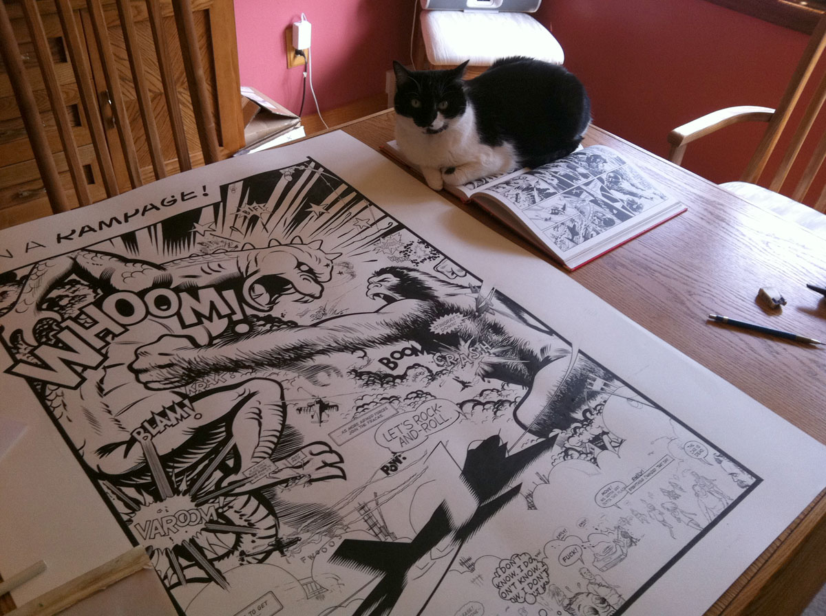OK–if this in-progress photo of Jim Rugg‘s knock-out double-page centerfold spread for the upcoming pood no.4 doesn’t knock your socks off then call a doctor! Get somebody to check your pulse–because, brother you must be gone, GONE from this world! I say-Cold! cold as a stone!