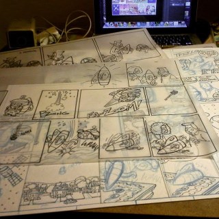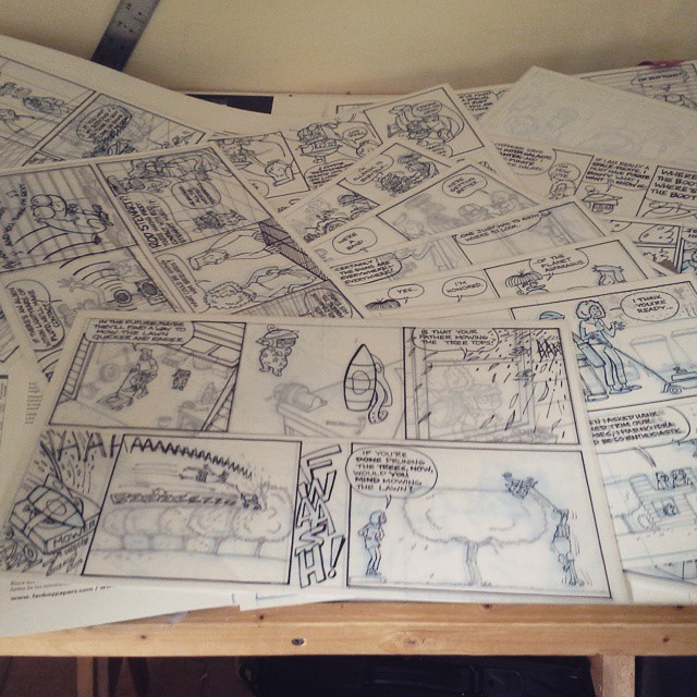 Recently, I revised my process to better accommodate the digital work I do in Photoshop, while retaining the hard-copy paper original. It’s old skool, I know–but I’m loathe to let go of the original, not so much for tradition’s sake, but I prefer being able to conceive of the work in real space–it helps me with scale, proportion(panel to panel-as much as figures within the panels) and most importantly, rhythm; the rhythm of the images and the words together across the strip. I like being able to judge the flow of the entirety in real space. What can I say? I’m old!
